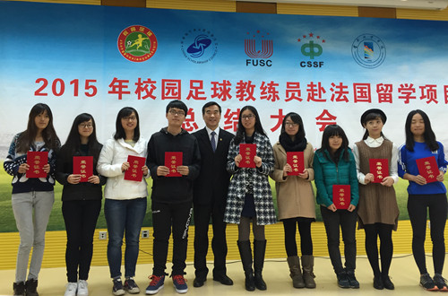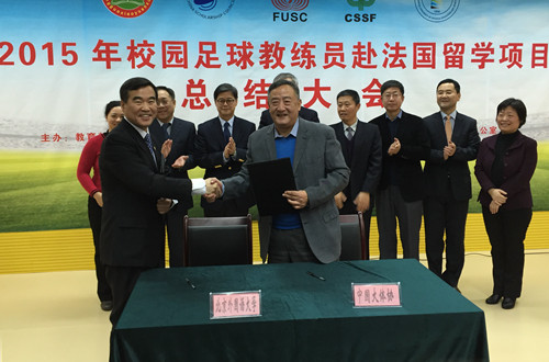 12月11日上午,由教育部国际司、国家留学基金委、全国青少年校园足球工作领导小组办公室主办,教育部学生体育协会联合秘书处、首都体育学院承办的2015年校园足球教练员赴法国留学项目总结大会在首都体育学院举行。我校副校长闫国华出席会议,并代表我校与中国大学生体育协会签署合作协议。