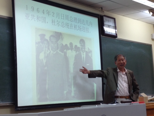 邢老师首先深情回忆了自己亲身经历的、1964年初周总理访问几内亚的过程和历史意义。然后,他结合在中国驻几内亚使馆、毛里塔尼亚使馆和马里使馆任职的经历,讲述了外事翻译和外交官工作对于外语毕业生的要求。最后,他勉励同学们勤奋学好法语,努力扩大知识面,不断训练综合思维和表达能力,并积极参加各类活动锻炼自己。