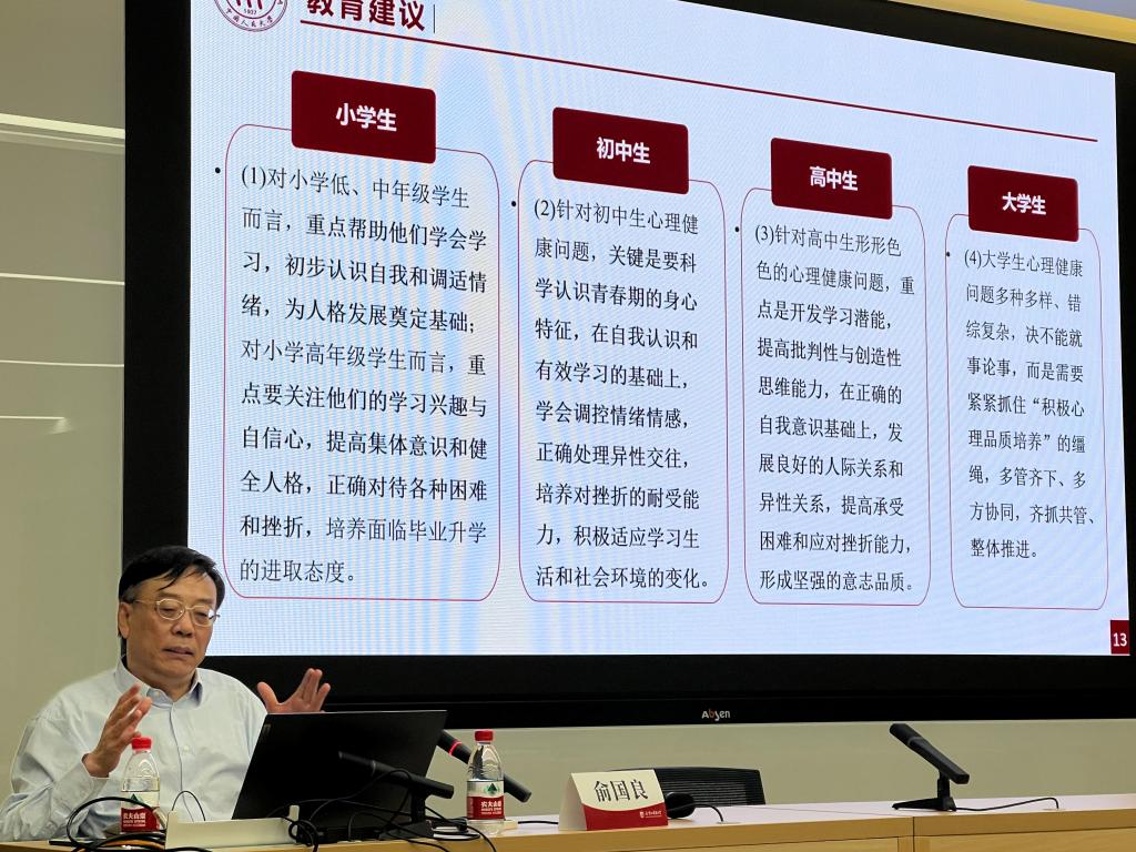 4月20日下午在东院主楼晨读厅,教育部中小学心理健康教育专家指导委员会秘书长、教育部高等学校心理健康教育专家指导委员会副秘书长、中国人民大学心理研究所所长俞国良教授来我校做讲座,题为《五育并举与中国学生心理健康问题检出率》。