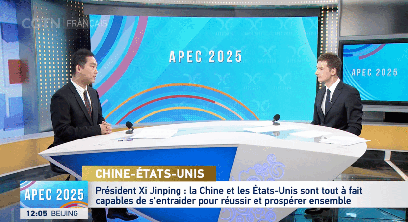学者王凝作为评论员,参与中国国际电视台(CGTN)法语频道APEC会议系列两场直播访谈,梳理了APEC多边合作机制的历史脉络与现实意义,结合会议主题阐释了“连接、创新、繁荣”三大关键词的实践路径,并重点围绕中美元首釜山会晤、区域互联互通、数字经济规则构建及人工智能治理等热点议题展开分析。