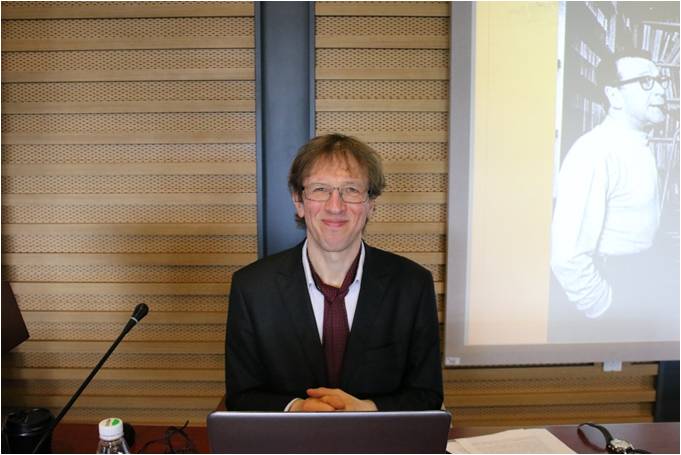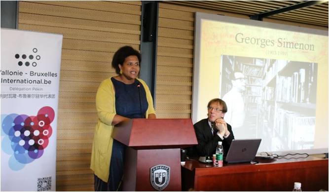 2018年5月8日下午4点,受比利时布鲁塞尔-瓦隆国际关系署和北京外国语大学法语系的共同邀请,比利时列日大学文学教授、乔治·西默农研究学者洛朗·德穆兰(Laurent Demoulin)先生在北外图书馆四楼学术报告厅举办了以《西默农生平及作品》(Georges Simenon : vie et œuvre)为主题的讲座。出席讲座的还有比利时布鲁塞尔-瓦隆国际关系署驻华代表丁爱宇(Emmanuelle Dienga)女士以及北外法语系的各位老师,本次讲座由北京外国语大学法语系比利时籍外教柯丹妮(Stéphanie Crêteur)女士主持。