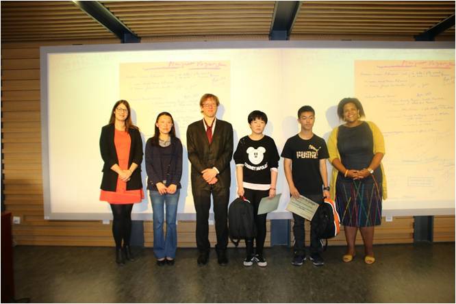 本次讲座的最后一个环节是乔治·西默农作品续写大赛的颁奖仪式。2018侦探之年,比利时瓦隆布鲁塞尔国际关系署与中国法语联盟一起,联合北京外国语大学、西安外国语大学、武汉大学、广州大学,在今年4月组织了侦探小说续写大赛,邀请所有在大学或法语联盟学习法语的中国学生为乔治·西默农的小说《死刑》创作结尾。本次大赛历时一个月,分为北京、西安、武汉和广州四个赛区,北京赛区最终匿名评选出了三位获奖者,由丁爱宇女士和德穆兰先生公布优胜者名单并为其颁发奖品。我系研究生潘晨茗荣获一等奖,我系本科二年级学生陈银荣获二等奖,来自天津外国语大学附属外国语学校的初中生周星锐同学获得三等奖。