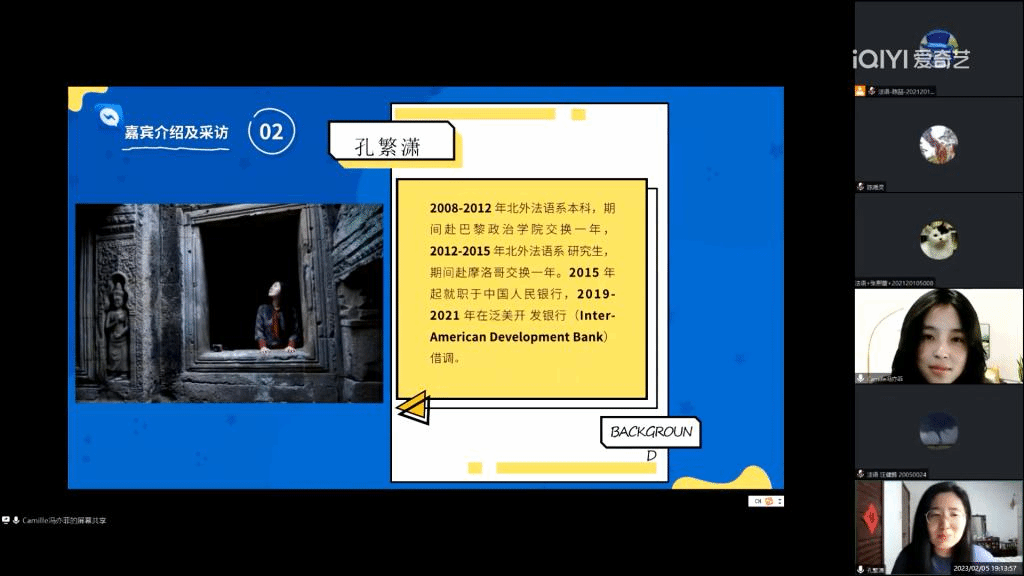 孔繁潇:2008—2012年北外法语系本科,期间赴巴黎政治学院交换一年,2012—2015年北外法语系研究生,期间赴摩洛哥交换一年。2015年起就职于中国人民银行,2019—2021年在泛美开发银行(Inter-American Development Bank)借调。