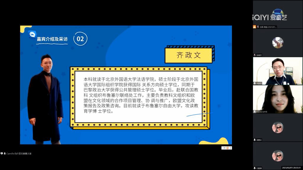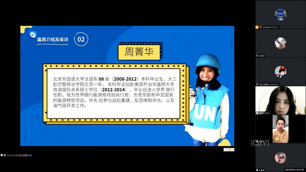 于2月5日以线上讲座的形式举行“职划之夜国际组织篇”讲座,邀请到四位在国际组织工作的校友与同学们交流分享职业经验。讲座为同学们了解国际组织的工作方式、选拔要求、未来发展等提供了宝贵经验。