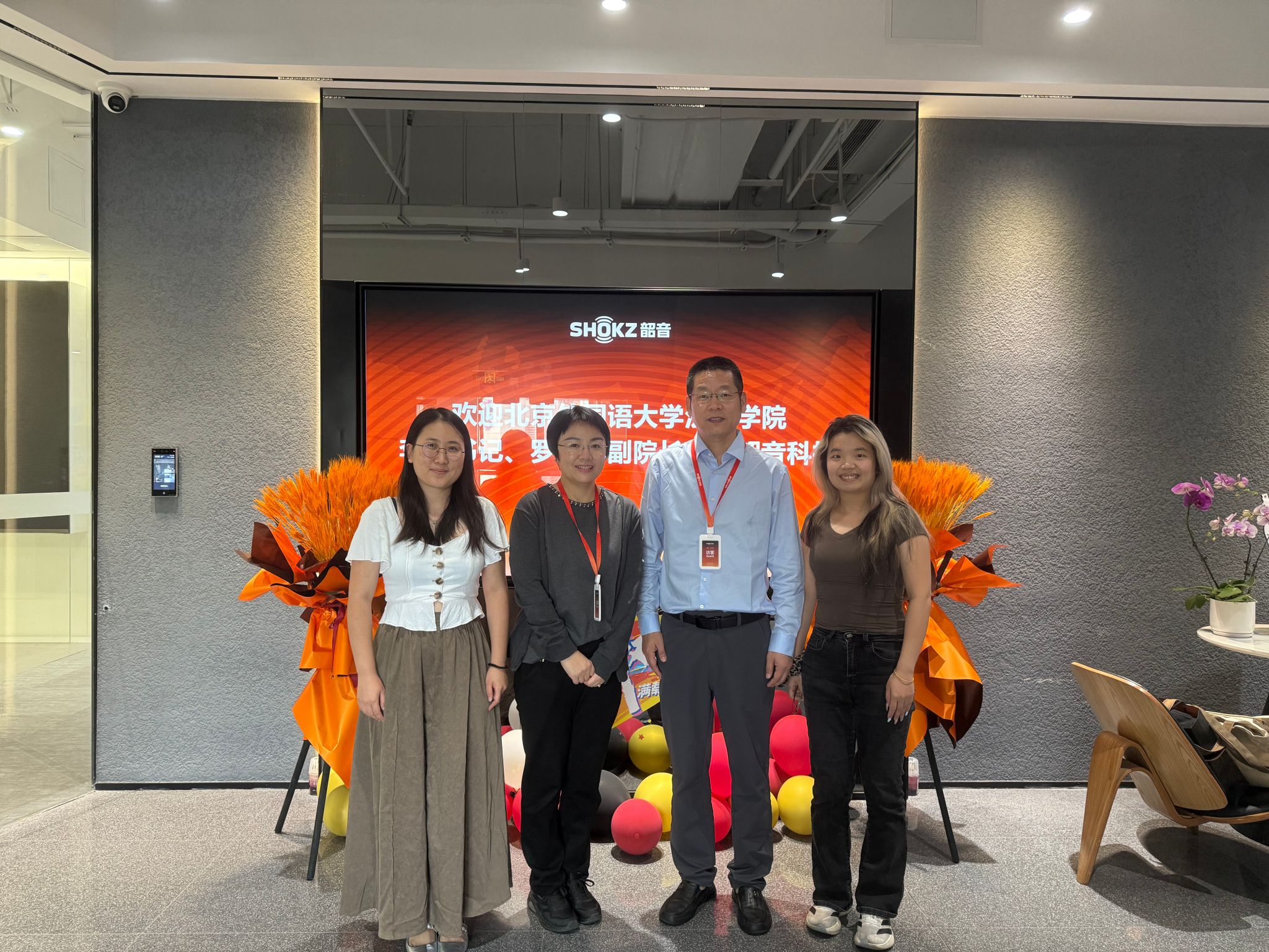 学院一行在韶音就职的北外校友的陪同下实地参观了韶音科技研究中心和海外营销中心,详细了解企业自2004年创立以来的发展历程、技术创新成果与产品特色。韶音科技作为一家专注于电声产品研发、设计、生产与营销的高新技术企业,始终坚持底层原创技术创新,在骨传导音频技术与定向声场等领域取得多项突破,打造了开放聆听的全新声学体验,其专业实力与发展前景给学院一行留下深刻印象。