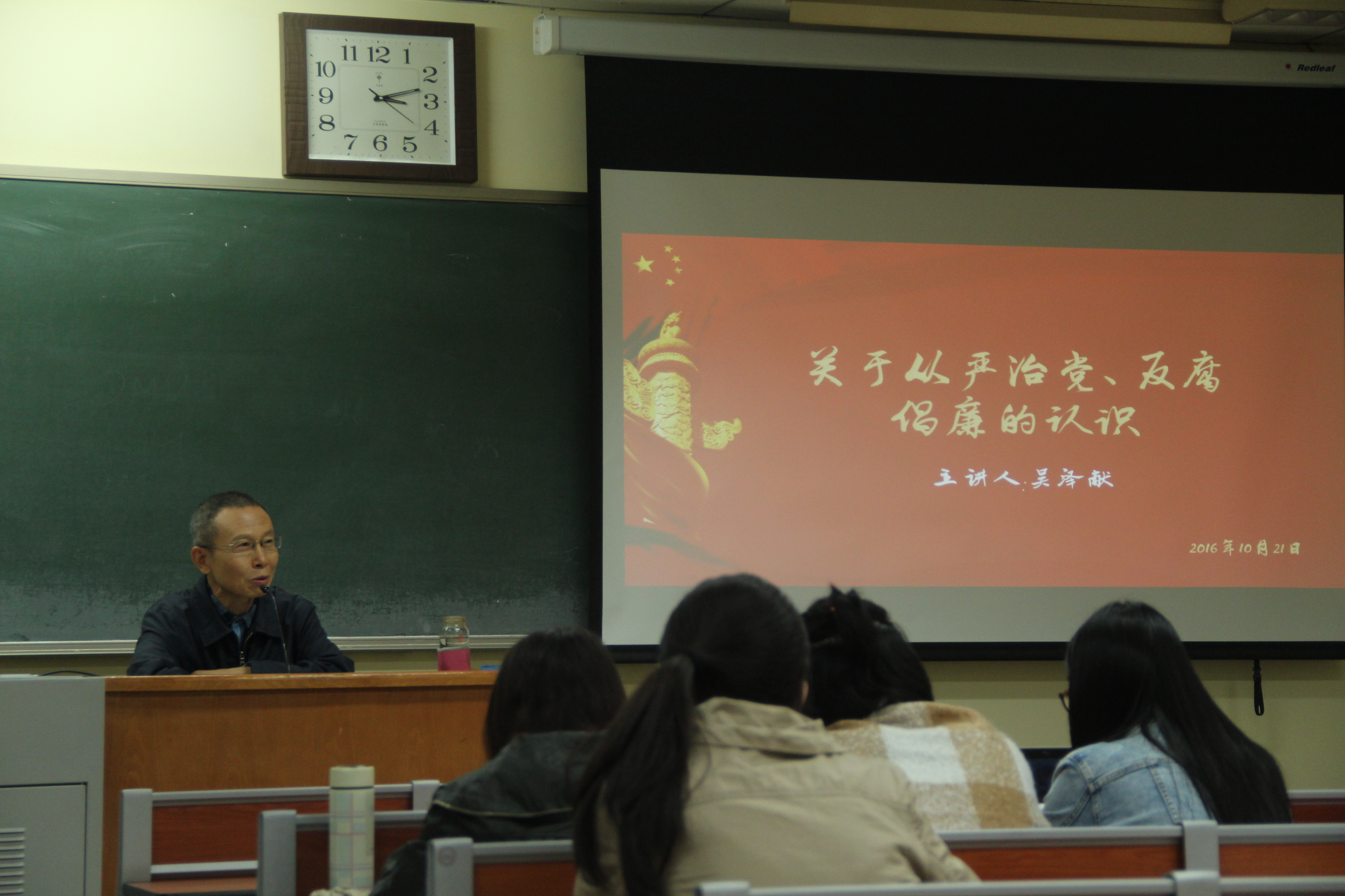 10月21日下午,受法语系党总支邀请,73级校友吴泽献大使为法语系全体党员讲了主题为“从严治党、反腐倡廉”的党课。