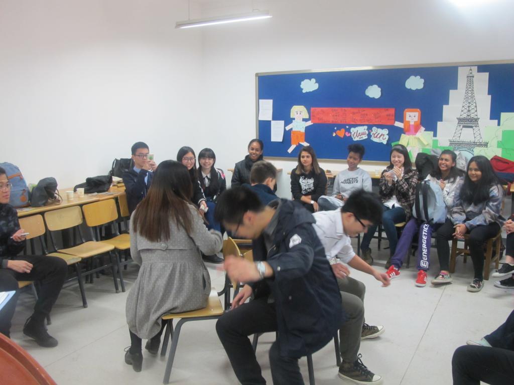 在品尝完颇具北京风味的稻香村糕点后,活动正式开始了。中法学生围坐进行简短的自我介绍,主持人提出要求,介绍人须重复上一人的名字后再报出自己的名字。这种接龙的形式活跃了气氛,也使大家互相熟悉了起来。随后,同学们踊跃地参加“你演我猜”的游戏,法国学生把游戏中出现的“李小龙”、“太极拳”等词演绎得十分传神,引得现场笑声连连。