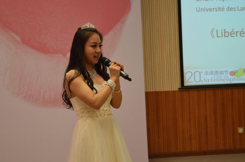 我校法语系的两位选手表现突出。大三的余芳同学演唱了Indila的Boîte en argent,她温柔的嗓音将歌曲中令人心醉的情感表现得淋漓尽致。大一的陈俞君同学则演绎了迪士尼动画《冰雪奇缘》的法语版主题曲Libérée délivrée。她那高亢而略带沙哑的嗓音,将大家又一次带入了电影情节中,一身雪白的公主装扮更是为她的表演添色。其他院校的选手也有十分出色的表现。最后,来自兰州交通大学大三的赵悦蓉同学凭借一首欢快的Mon homme和一口优雅的法语勇夺冠军,我校法语系大一选手陈俞君获得了第六名。