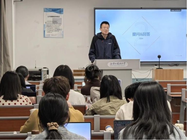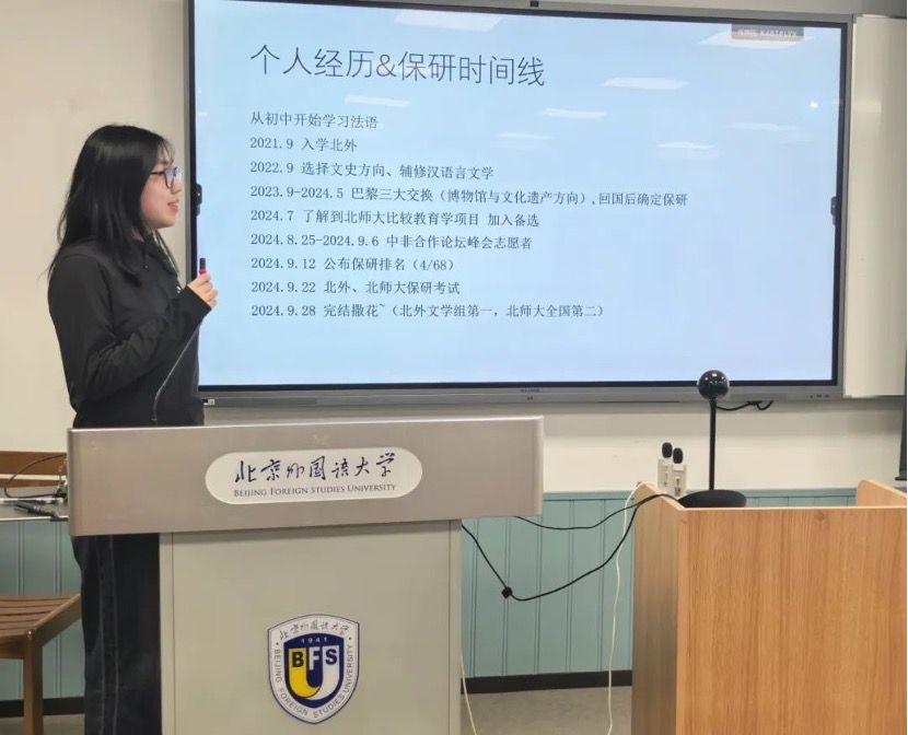 接下来,保送至北师大的刘雪菲从个人经历、学术成果、准备策略及方向抉择等方面进行了分享。她强调学习是保研的关键,并以自身专业为例为同学们讲解了考试要点与准备方法。在保研方向选择上,她建议依个人特质,综合导师、法语能力、研究兴趣等设定条件,鼓励凭热爱探索新方向,利用文科互通性拓宽选择。