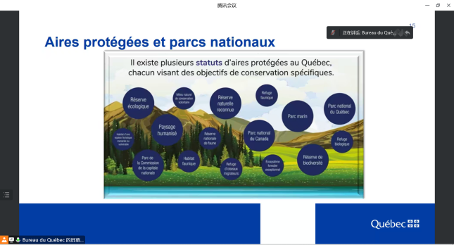 Czor先生重点介绍了魁北克的自然保护区与国家公园,两者的建立与发展是魁北克政府保护生态环境、对抗气候变化的主要手段。魁北克的自然保护区构成了系统性的网络,涵盖所有生态系统类型,且范围在不断扩大。政府还对自然保护区进行细致的分类,赋予其不同的地位和性质,以施行有针对性的管理与维护。