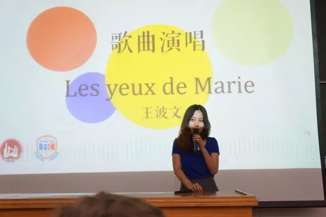 经过第一轮的角逐,共有八名同学进入第二轮的比拼。第一环节结束后,我校大一年级的王波文、大二年级的陈丽妃分别为大家演唱了Les yeux de Marie和Quelqu’un comme toi两首优美的歌曲,在场的同学老师们都沉浸在甜美的歌声中。