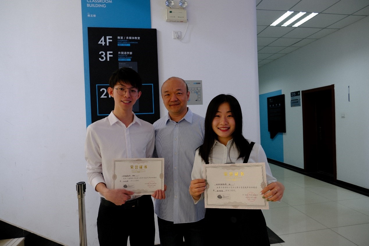 研究生2019级张文月、许祝同学凭借扎实的语言功底、宽阔的知识面和出色的口译技巧,荣获汉法同声传译邀请赛团队三等奖。