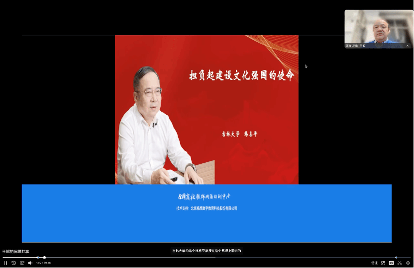 第四讲“担负起建设文化强国的使命”,由教育部“长江学者奖励计划”特聘教授、中央马克思主义理论研究和建设工程首席专家、国务院学位委员会第七届学科评议组成员、吉林大学马克思主义学院韩喜平教授主讲。他曾任“马工程”首席专家和主要成员,主编《毛泽东思想和中国特色社会主义理论体系概论》《马克思主义经典著作选读》《马克思主义发展史》等教材近10部。独著、合著学术著作10余部,由其主编的“十八大主题书系”丛书被评为“全国优秀社会科学普及作品”,所著《中国特色社会主义民生制度建设研究》入选2022年度《国家哲学社会科学成果文库》。